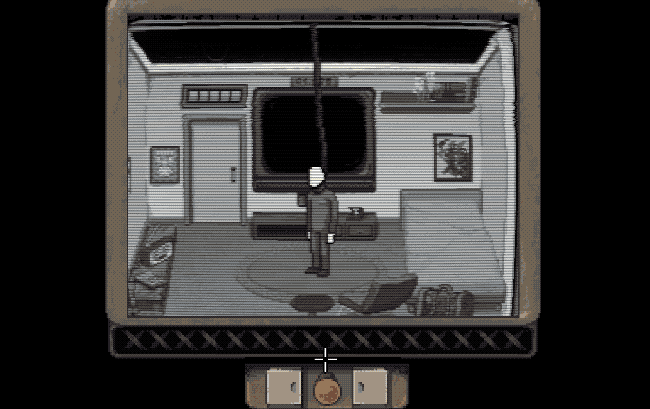 In 33 you start the game with just you in an empty room and a big TV screen against the back wall. Some authoritarian looking propaganda plays out on the TV and then you see another prisoner in their own cell, with a large noose around his neck. You press a button that appears below the TV and the prisoner is swiftly executed and 100 credits are deposited into your account – which you can then use to buy items to furnish your cell. With a few more lives you’ll be able to furnish your whole cell.