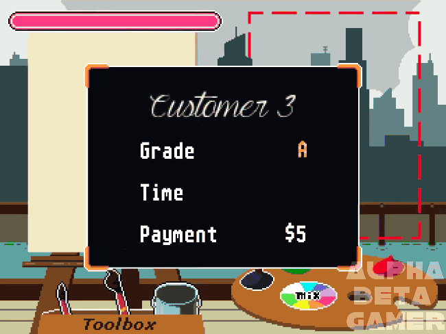 Time is money, as it is said. In this game, it could not be more true. The player, a starving artist so to speak, is looking to make some money on the streets by painting customers portraits. The customer can also pick a background to accompany his or her face and body in the painting. To make sure you do not spend too much of your precious time on one person, the player only has 90 seconds to complete a painting for the customer. Using your trusty tools, you must get this painting done to the best of your abilities to earn the most amount of money possible by the end of the day (which is a total of 5 customers).