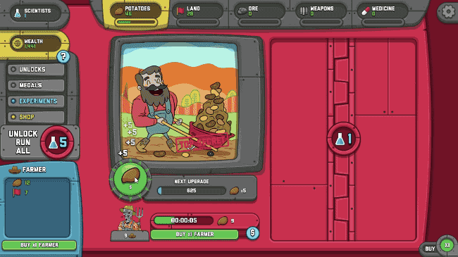 In AdVenture Communist your aim is to grow your quaint little potato farm into a vast empire that deals in ore, weapons, medicine and even more potatoes! Those who have played AdVenture Capitalist (or any incremental clicker) will know the drill – click to earn cash, to buy more upgrades, to reduce the amount you have to click to earn more cash.