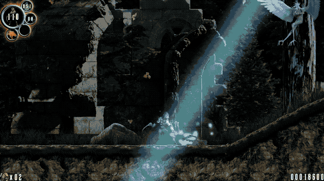 Aurora uses a Castlevania-style whip and the monsters you come across are similarly occult themed, but Anathema isn’t a metroidvania. It’s much more of an old school side scrolling action platformer akin to Ghosts n’ Goblins and Mega Man X. The current Demo build offers a sizeable chunk of gameplay, with large levels populated by diverse monsters, secret areas, challenging platforming sections and big boss fights at the end of them.