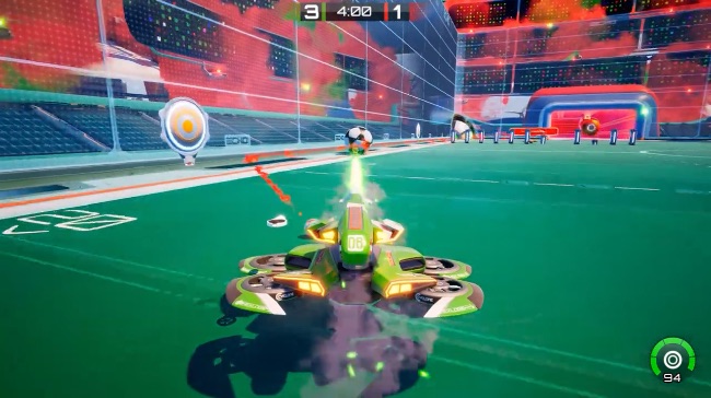 The vehicles are a little slower, but thanks to the fact that they’re not confined by wheels, they’re far more maneuverable than in Rocket League, with them able to move in all directions rather than just forwards and backwards (you can’t strafe in Rocket League). You also have a gun with different fire modes which you can shoot at the ball to knock it around the arena – in fact this ends up being the primary way of knocking the ball around rather than hitting it with your vehicle.