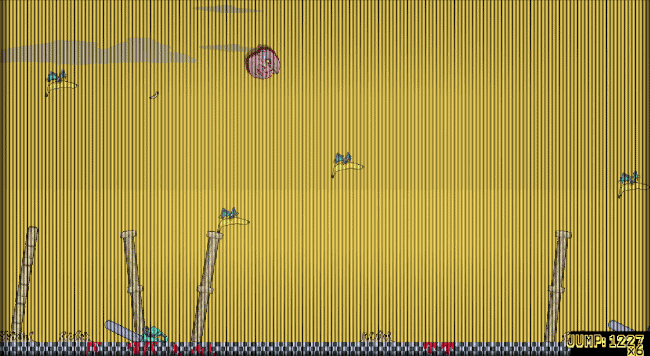 The single button control scheme of is Banana Boy is easy to pick up and play, but the game is surprisingly hard to master. Your disembodied head continually bounces along the ground and you must press the Spacebar to send it into a nosedive to ensure that it lands on the soft piles of maggots instead of the hard floor or chainsaws. Hit the maggots and you’ll be propelled higher up into the air, earning more points and being able to collect more bananas, but if you hit the bare floor you’ll wreck your face and lose some health (while hitting a chainsaw results in instant death). It’s quite easy to time your button presses at low altitudes, but the better you do the higher Banana Boy’s head will bounce and the harder it is to time your dives.