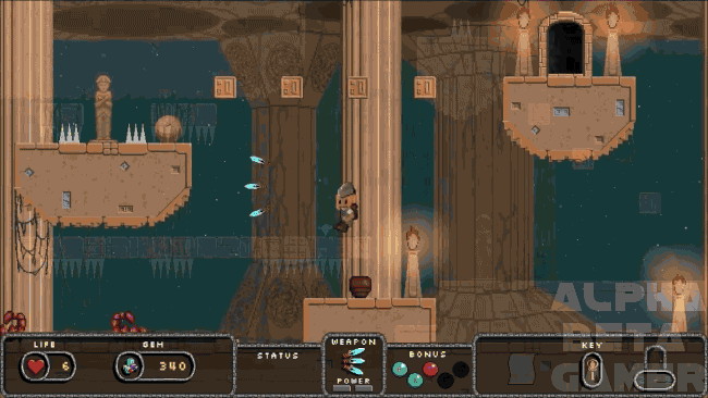 You have to be very careful as you make your way through the levels, you only have 3 lives and one hit is enough to kill you. Thankfully there is some assistance from a shopkeeper, who’ll sell you useful weaponry and armor if you’ve collected enough gems. Overall the game feels a lot like Spellunky (in a good way), but without the procedurally generated level design – which is actually a welcome omission as it gives players slightly better odds of surviving as you learn where all the sneaky traps are.