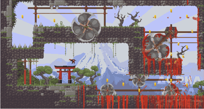 The mouse based control system works remarkably well (once mastered), with you able to run, jump and wall jump at any angle you desire. You start each level with 10 seconds on the clock, if this timer reaches zero, you’ll de and splatter blood everywhere (which is persistent, staining the level with blood). There are coins scattered across the level that you can collect though, buying you a bit more time. Even without worrying about the timer though, there are many other ways to die, with spikes and circular saws ready to cause instant death.