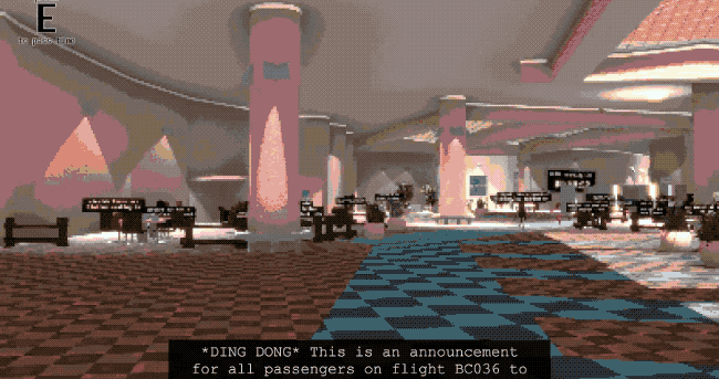 You are at a somewhat busy airport. There isn’t much to do while waiting for your fight, apart from exploring around and seeing what other people have to say. Everyone around you seems to be talking about the airport around them – reviewing everything they have experienced up until this point. Your plane isn’t boarding yet, clocks everywhere countdown the time, so there is nothing to do but explore until then (and then when it gets cancelled wait a bit more). If you’d rather not explore and instead just want to pass time, you can press E and watch your character do his own thing. He might go and sit down or wander around a bit. You’ve got plenty of time to waste!