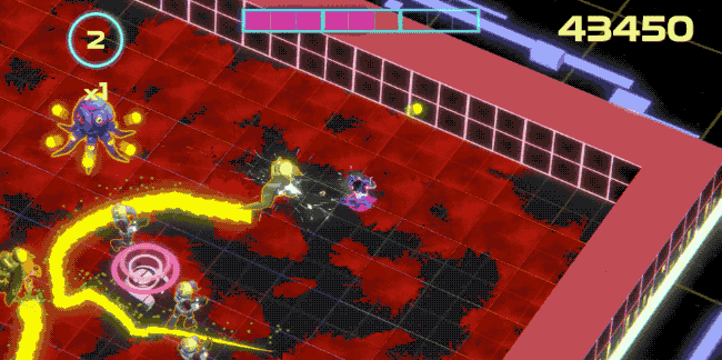 You’ll encounter 11 types of enemies as you battle your way through the game, each with different attack styles and each wave getting more difficult as bullets and alien bodies fill the screen. It’s very tough, but thankfully you have a nifty ability to grab stunned aliens and eat them, replenishing your health in the process.