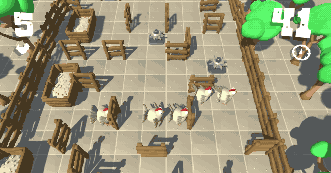 You start Clucked Up! With six chickens and a randomly generated assault course of fences and deadly traps standing between them and their henhouse. Your aim is to get them to the hen-house as fast as possible while losing as few as possible to the deathtraps. This would be easy enough if you could move the chickens independently, but they all move simultaneously and with very little regard for their own personal safety!