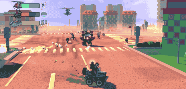 In Combowar you start off in a little Jeep equipped with a machinegun and a rocket with an aim of wiping out an entire army then blowing up their base. There are no power-ups in the game, but it features a unique upgrade system that allows you to switch between vehicles on the fly. Each time you attack an enemy unit while driving the Jeep, the power bar rises for the Attack Chopper, which will then allow you to transform into instantly by pressing the right mouse button. Attacking enemies with the Attack Chopper in turn makes the power bar increase for the Mech, which when full will auto-transform you into the Mech and allows you to kick some serious ass.