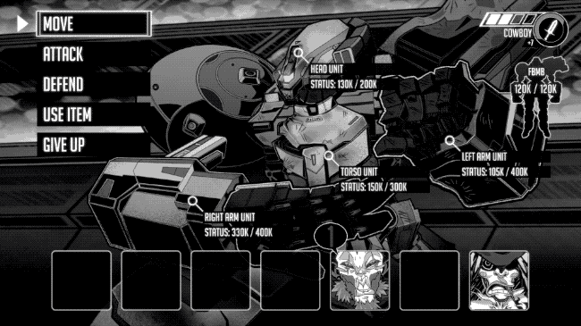 The current demo build of Corona Black doesn’t feature any of the narrative though, instead thrusting you straight into a battle against a heavily armed mech. The combat is turn based, with you able to move, defend, use items and use a selection of attacks. It’s not the deepest of combat systems at the moment, but it’ll no doubt get more strategic as you face stronger opponents and unlock upgrades. One nice touch is your ability to use one of your attacks to scan your enemy and learn their weaknesses and stats, and you can also target individual parts of the enemy mech to disable them.