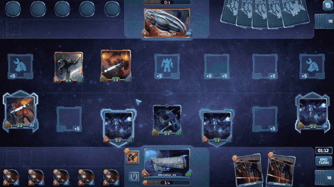 The CCG combat in Cosmos Invictus is very easy to pick up and play but hard to master, with it’s simple premise backed up by layers of strategy. You lay your cards on one of the seven available slots on the battlefield in front of you, with each space usually offering some type of buff, then you use them to attack your opponent’s mechs and command ship. There are lots of intricacies to the game, such as upgrading your command ship, refuelling and equipping the mechs with pilots – all of which can really affect your success on the battlefield. The combat is all stat-driven, with no RNG, so the best strategy (cards willing) will generally win the match.