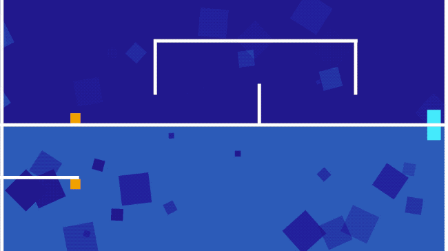 In Deleveled you control two little cubic avatars simultaneously, with both of their movements mapped to the same keys (so when one moves right the other will move right, etc.). Neither of the little cubes can actually jump, but if one drops from a high platform and lands on the surface that separates the two then it will propel the other one equally high in the air. You must figure out how to use this ability to traverse the obstacles throughout the games cleverly crafted levels.
