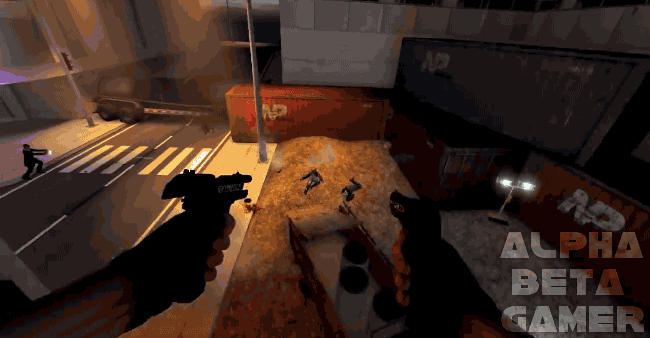 The game can either be played from a 3rd person or first person perspective (switch with ‘J’), both work well, but 3rd person looks way cooler when you’re flying through the air. Comparisons to Max Payne are obvious (especially as you’re able to slow down time), but your character is far more versatile, the action is more OTT, and the gameplay is more fun – double the fun!
