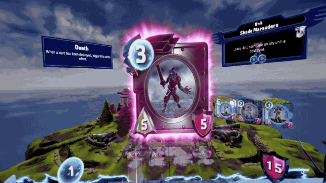 Dragon Front’s full embrace of VR allows the game to create an immersive CCG experience like no other. Players can survey the battlefield, and use 280 character cards, 80 encampments and over a hundred spells, all of which are beautifully realized before your eyes. Dragon Front also allows for a more personal approach to the battles, with you able to look across the battlefield into your opponent’s eyes as you plot their destruction (Your opponent is represented by an ornate mask, but head tracking gives it life).