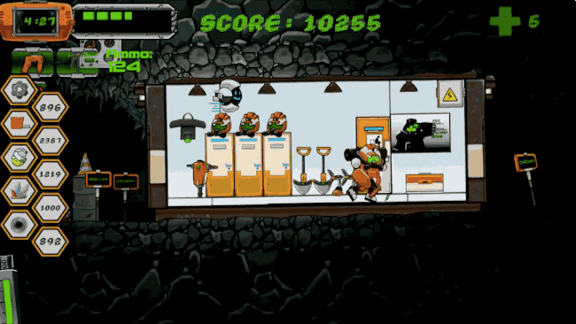 End of the Mine is an incredibly well drawn game and is a blast to play. The opening cutscene as you wondering “just what where those things flying towards that guy, and better still who was that guy?”. As you drop in to the game you’re greeted with an information screen teaching you which keys to use and which buttons do what in the game. The ambience combined with the amazing level design instantly creates a swirl of fear that lingers in the back of your mind. There isn’t much music in the game yet but it helps set the tone for what you’re about to encounter, and also also makes you feel truly alone in this darkened cave. The colours are bleak and dark, making you feel as though the walls may cave in on you at any moment. The enemies contradict this and have bright hues and contrasts to make them more distinguishable.