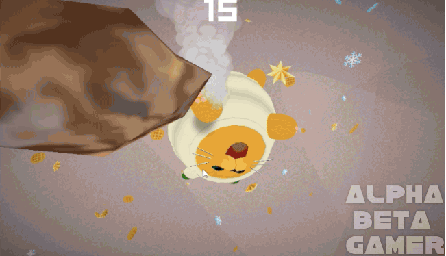It’s an easy to pick-up-and-play game with intuitive controls – your rotund feline turns as you move the mouse. You simply have to get lined up so that your mouth is facing towards any incoming food and away from any hazards (bombs, rocks, rockets) so that your tail can bat them away. The more you eat, the fatter you get, and the more difficult the game gets as more objects hurtle towards you (probably due to your increased gravitational pull!)