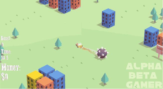 In this colorful, addicting game, you must drive around a small car with a huge spiked ball attached to the back of it, destroying as much as you can in just one minute. This ball flairs around, smashing into trees and buildings, destroying them in a colorful blast of blocks. As it destroys the environment, the ball becomes larger. Each time a building is destroyed, you gain more money.