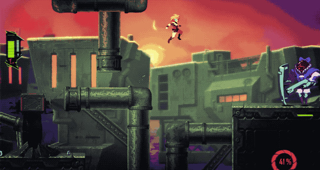 In GIGABUSTER you must break into the headquarters of nine powerful companies who are planning to merge and fund the ‘Happiness Project ’ – a project which is likely to only bring happiness to those who run it and misery to the rest. The Kickstarter demo features around 15 minutes of gameplay, with one large level to make your way through and a CEO boss to battle. You have a nice array of movement abilities and attacks, all beautifully animated with high quality cartony visuals.