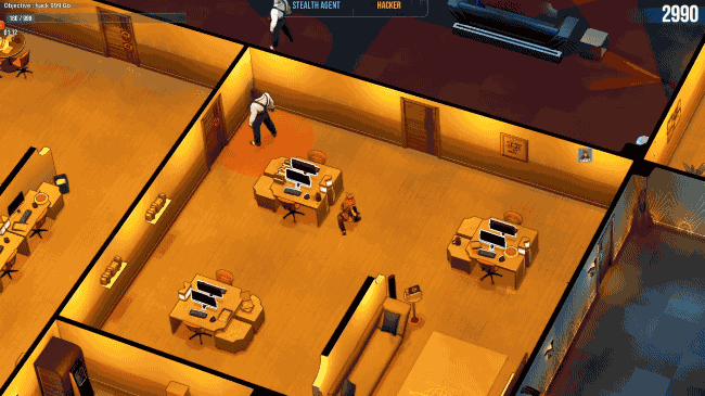 During missions one player controls the Stealth Agent and another controls the Hacker. The Stealth Agent must sneak through the isometric game world, using distractions and avoiding or taking out guards while making their way to the goal. The Hacker on the other hand hacks their way through a holographic blueprint of the level, interacting with cameras, doors, phones and other equipment to open the way up for the Agent and divert the attention of the guards.