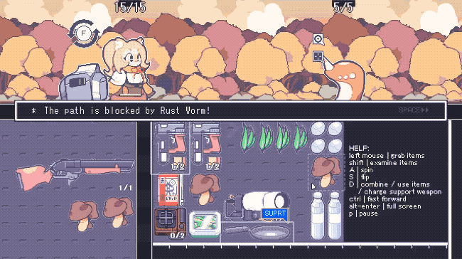 You will need to constantly be arranging your inventory in a way that you can keep what you want. Some items, like ammo and guns, can be combined (as a way of reloading). You can even create food in a pan and cook it on the stove! There is a small bar in the top row of your personal inventory. This is the row of stuff that Casie will grab when she is fighting. You will need to be aware of what is blocking this line – weapons without ammo, garbage, food does not help Casie fight. Once she has used an item, she also throws it back into the floor for you to grab once again, if you want to keep it.