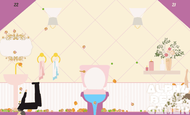 After consuming undercooked shrimp on their wedding night, the newly weds are hunkered down in the bathroom ready for the worst. What follows is an explosion of barf and faeces as players take control of one the happy couple each, and aim to get as much of barf into the toilet as possible. The player with the most barf in the toilet wins (but there really are no ‘winners’ in this game).