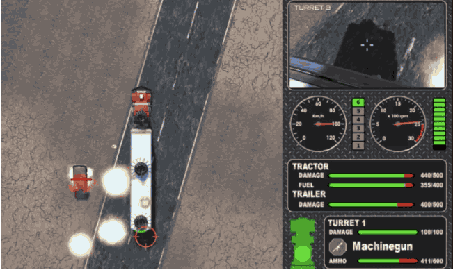 Playing like a mix of first person shooting, tower defense and truck driving, you choose the weaponry to attach to the three slots on your truck then roll out into the hazardous wasteland. It’s not long until you run into trouble and must use your selection of artillery to blow up the enemy vehicles that hound you. You can aim by aiming the mouse on the big screen on the left or via the small first person view on the right hand side of the screen (which usually allows you to see further).