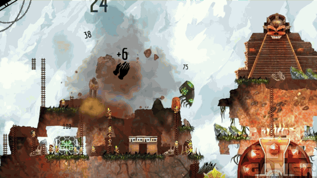 Each turn you can either move, build or attack, with an aim to demolish your opponents ‘heart’ while protecting your own. The short turn time and the way both players move simultaneously, make for some gloriously chaotic battles that really are a blast. Players can even team up against huge Mayan Gods who are disapprove of your blasphemy, as your followers worship their false idol.