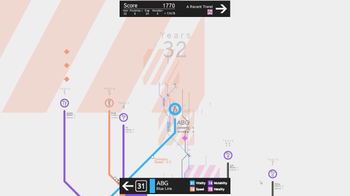 You gain points for the number of years you go on for, the length you cover, the length of your child lines and the number of mutations you achieve. You have to keep on collecting those colored pellets though – if you run out of health then it’s game over.
