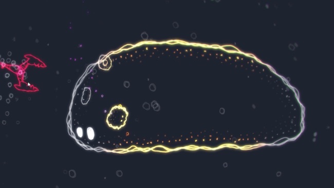 Food trails behind you when you run into it, waiting to be brought home. Once it’s given to your home, it turns into little organisms that follow you, shooting along with you and protecting you. After a while, you can build up a bunch of these organisms, which are now your family members, to help you survive.