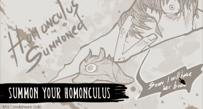In the game you combine ingredients to summon a homunculus – a small blob like creature that you need to nurture like a virtual pet. After you’ve cared for the little creature enough you can then transmute it into what will hopefully become your daughter (but will most likely turn into a grotesque disfigured mutant), and then you decide its fate. It’s very unlikely that your initial experiments will create the desired results, but as you progress you’ll unlock new ingredients and will hopefully find some form of success.
