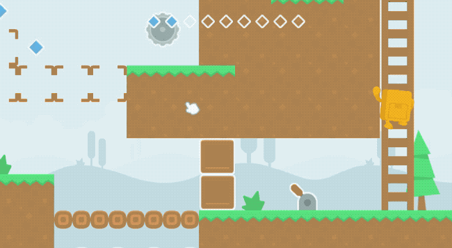 In Pixepal you control your character as in a traditional platformer, but you are also able to click and drag aspects of the level that are highlighted in white. This can be keys to doors that are locked, saws to break boxes, or the boxes themselves. You will also have to click on green dot boxes to activate them or deactivate them leaving a shell, as well as switches. While you click and drag, the whole screen will look like it is glitching out to show you are manipulating the level.