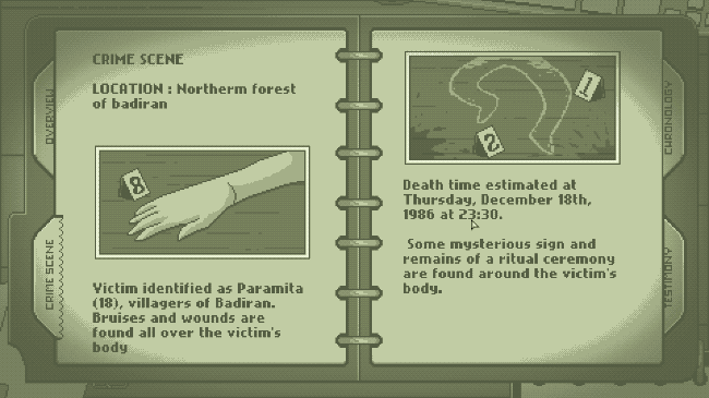 In Room of Truth you are given a case file to look through and a prime suspect to interrogate. The suspect in question is a 65 year old shaman who lives in a small tribe where the victim was also from. The victim was found at the outskirts of the village, with heavy injuries all over her body and surrounded by items that seem to indicate some form of ritual has gone on.