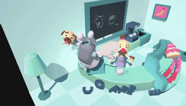 In Space Co-Op QWOP in a Coffee Shop you control your little astronaut with the WASD buttons and are able to grab things with the Q and E buttons if they’re in reach. You have a list of tasks that you have to complete, such as placing the dog behind the bar or being overly affectionate with a customer, but performing them is particularly tricky as you are in zero gravity and can only move your astronaut by firing the four thrusters on your backpack.