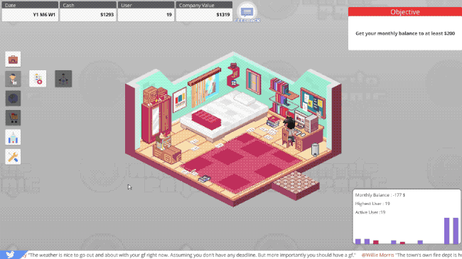 Startup Panic is an easily accessible but surprisingly deep business simulation game that plays like a more complex version of Game Dev Story as you build your one man software company into a Facebook-esque social media empire.