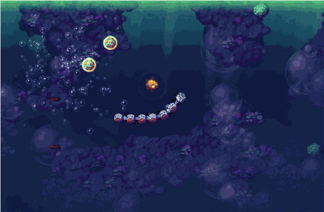 Subdragon is a super cool pixel art side scrolling shooter in which you control a mechanical serpent that has impenetrable armor down one side and a line of guns down the other.