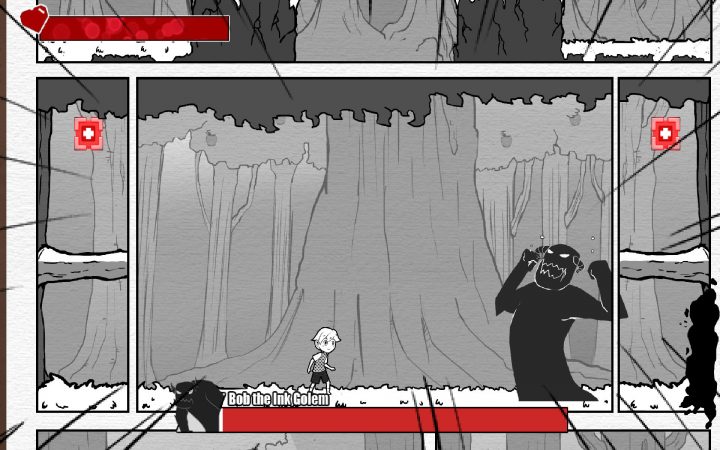 Comic Crossover is a quirky puzzle platforming action adventure that sees you exploring two comic book-based worlds that have become overrun by inky black slimes.