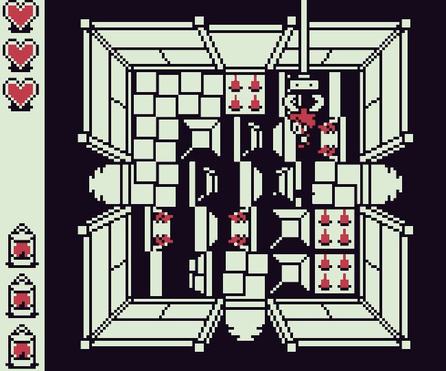 In The One Room Experiment you control an adventurer who must collect all the lanterns within in a dungeon. This is no ordinary dungeon to explore, however, as it all takes place in one room. Every time you enter a door, the tiles under your feet flip around and claws drop from the ceiling, adding objects and arranging the room. This all happens quite fast, quickly changing the room you were in, into a whole new area. You must explore these rooms, avoiding spikes, destroying enemies, and finding your lanterns.