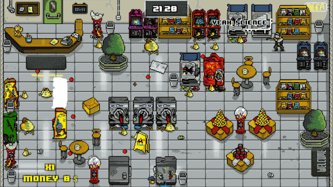 The Rubber Robbery is made up of two separate phases – the robbery phase and the escape phase. During the robbery phase your aim is to shoot rubber bullets around the store you’re trying to rob, causing lots of cash to fall out the machines the bullets bounce off which you can then collect. You can get hit by your own bullets as much as you like in this phase, but it will slow you down and hamper your loot grabbing activities.