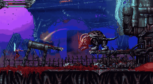 Valfaris blends heavy metal, gore and Contra style side scrolling action platforming as you slice and shoot your way through a beautifully horrific Giger-esque biomechanical world.