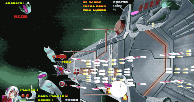 Add-On power-ups add turrets either side of your ship which you can aim with the LT and RT buttons. The Shield power-up is an R-Type-esque pod that attaches to the front of your ship. It protects you from incoming forward fire and you can jettison it for a powerful attack (this destroys the shield pod but it usually doesn’t take long to pick another one up again). Weapon Power-Ups upgrade your firepower and Risk Stars float around in risky areas of the screen, granting you risk points if you manage to collect them.