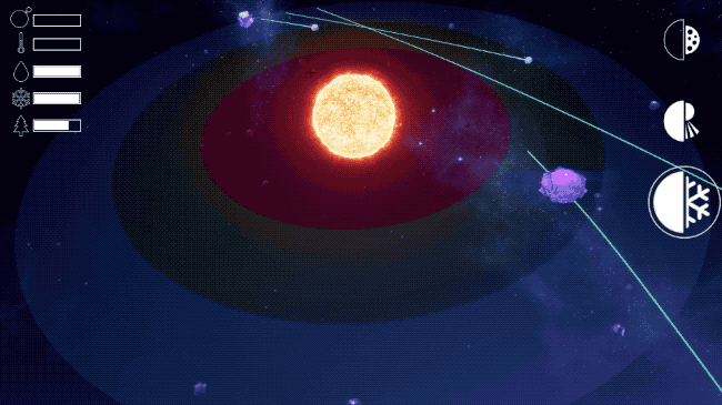 Each atmosphere outside the sun is a different color and provides your planet with a different resource. As you go into these different atmospheres, you will gain more of a specific resource or lose some of others. For example, if you are close to the sun, your water will start to dry up. If you are furthest away, your water will turn to ice. If you are in the green area, your trees will grow. All of these different attributes can be seen as they transform your world – you can zoom into your planet by clicking it and watch its surface change before your eyes, becoming a completely different type of planet.